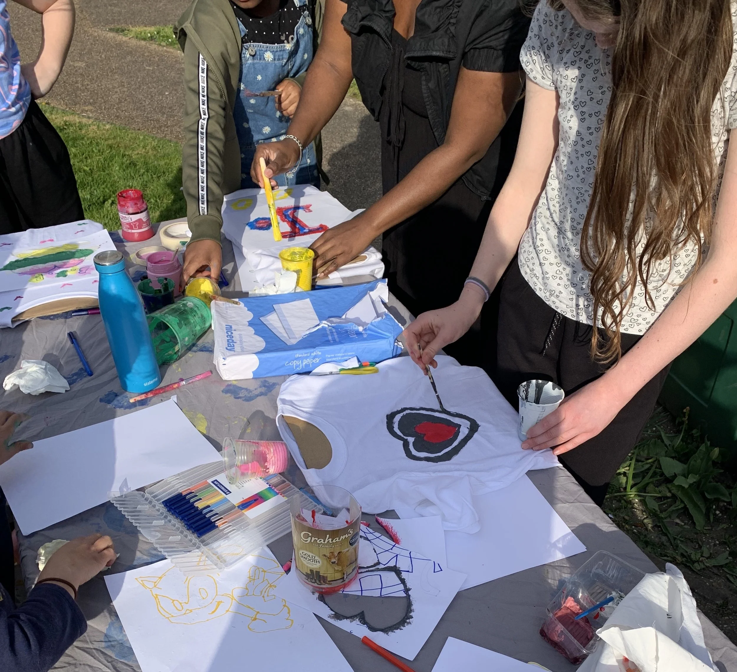 April 2022 [expand trigpos="below"]During the Easter school holidays, we have been running workshops on housing estates accross Lewisham on behalf of Clarion Housing. Children on Orchard Gardens, Newstead and Leybridge Estates were given opportunities to experiment with new materials and techniques and make artworks which they took home to play with or use, making wings and wall hangings, and printing their own t-shirts. Thanks to artists Joana, Ruth, Leonie, Natasha, Ben and Ellie for facilitating the workshops.To see all the fabulous things the children produced check out the blog and tumblr