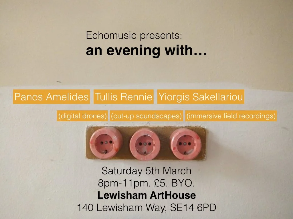 [/column][column]Saturday 5th March 2016Echomusic presents an evening with...Panos AmelidesTullis RennieYiorgis Sakellariou(digital drones) (cut-up soundscapes) (immersive field recordings)8.00-11.00pm£5 EntryBring Your OwnStep-free access[/column][/column-group]