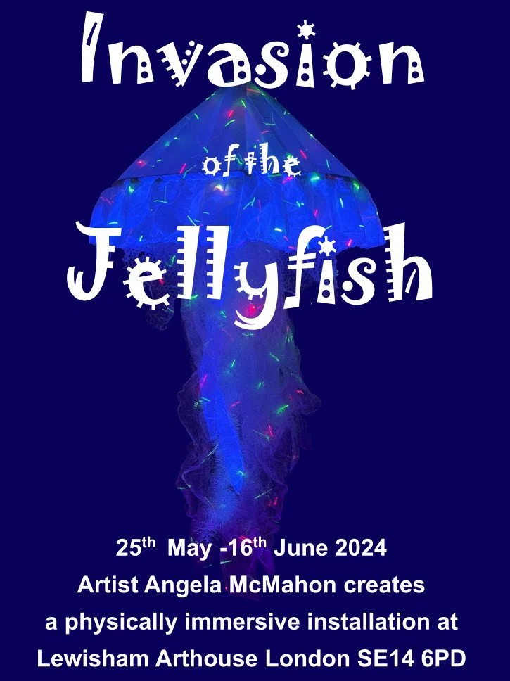 Artist Angela McMahon creates a physical immersive installation composed of suspended and floor-standing sculptures of fantastical sea creatures at Lewisham Arthouse. By imagining the undersea world where pollution and climate change have created the ideal conditions for jellyfish to thrive, Angela McMahon’s use of collected and reclaimed materials draws on scientific research to highlight some of the key environmental issues that are changing our oceans. In this imagined world, other species die out, and mutant sea creatures evolved from plastic waste lurk lower down in the water column and on the seafloor.