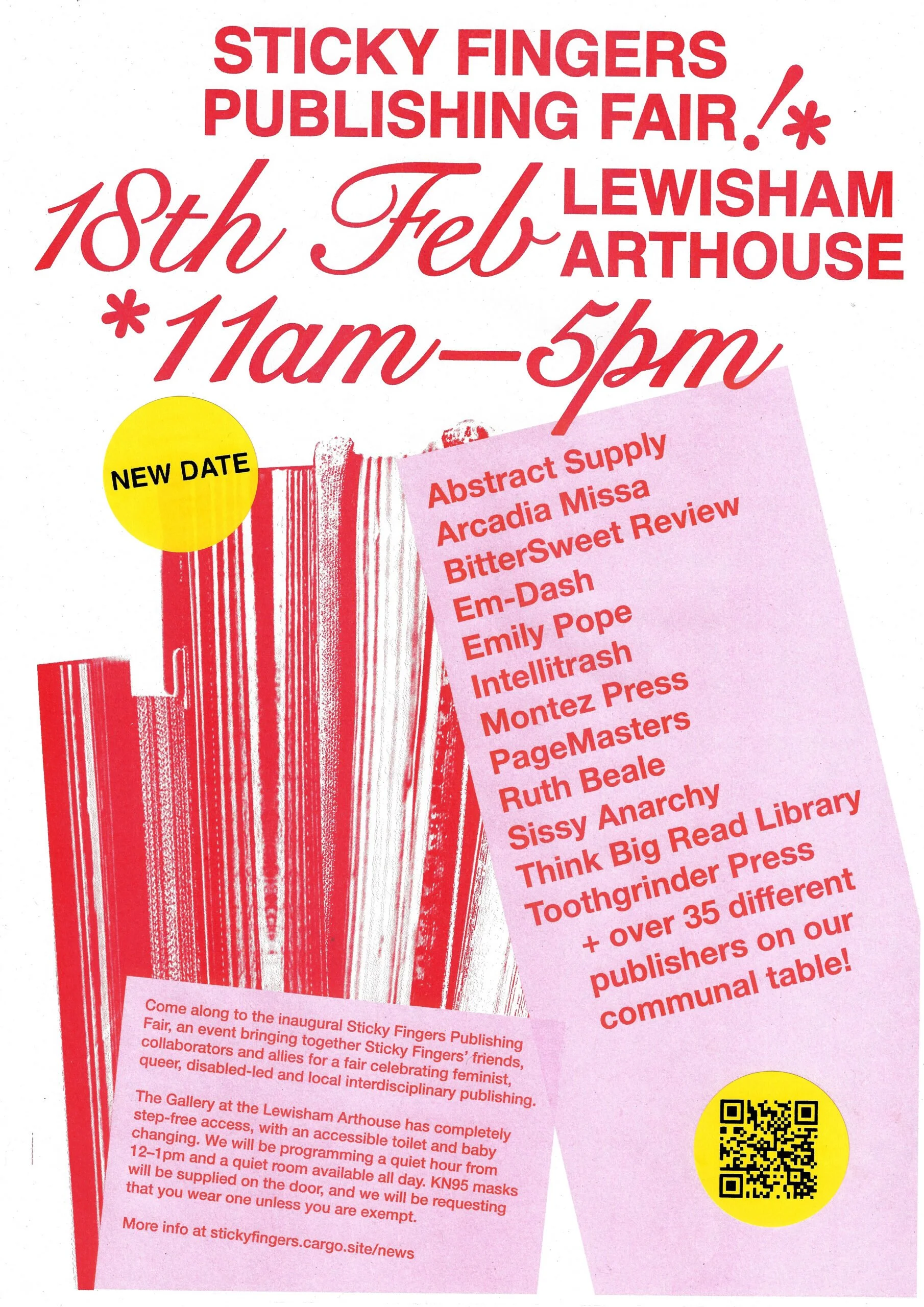 Come along to the inaugural Sticky Fingers Publishing Fair, an event bringing together Sticky Fingers’ friends, collaborators and allies for a fair celebrating feminist, queer, disabled-led and local interdisciplinary publishing. Featuring Abstract Supply, Arcadia Missa, BitterSweet Review, Em-Dash, Emily Pope, Intellitrash, Montez Press, PageMasters, Ruth Beale, Sissy Anarchy, Think Big Read Library, Toothgrinder Press, plus over 35 different publishers on our communal table. The Gallery at the Lewisham Arthouse has completely step-free access, with an accessible toilet and baby changing. We will be programming a quiet hour from 12–1 pm, and a quiet room will be available all day. KN95 masks will be supplied at the door, and we will be requesting that you wear one unless you are exempt. More info at stickyfingers.cargo.site